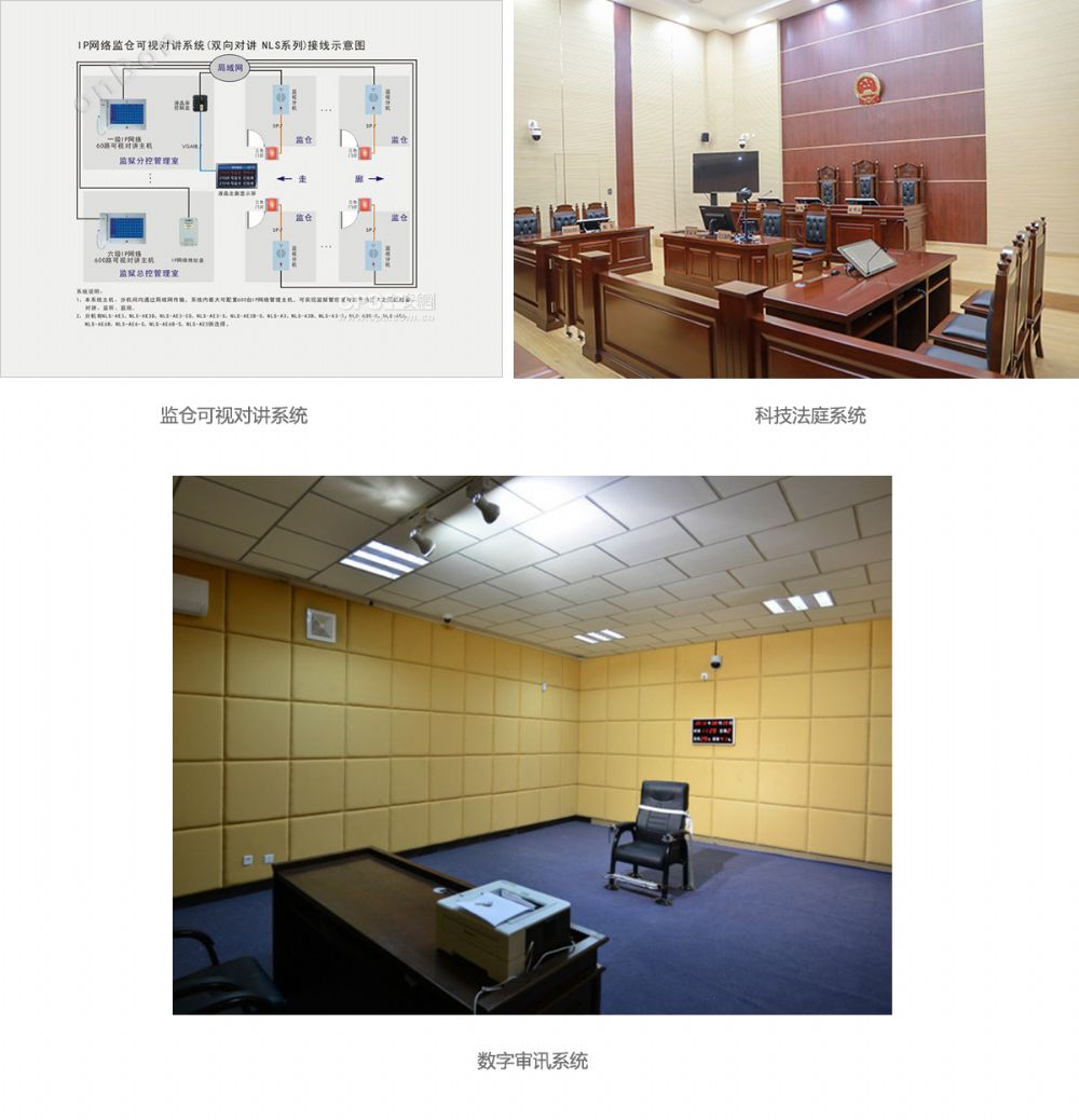 智慧法院 • 科技法庭系统;智慧检察院 • 数字审讯系统;智慧看守所 • 监室智能交互报告系统;智慧监狱 • 监仓可视对讲调度系统。
