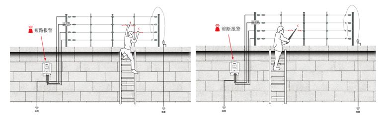 脉冲电子围栏系统:由脉冲电子围栏主机和脉冲电子围栏前端两部分组成,脉冲电子围栏主机发出安全的高压脉冲电,并输送到脉冲电子围栏前端(合金线),脉冲电子围栏主机通过监测脉冲电流是否有短路或断路的情况,来判断是否发生入侵。当有入侵时,脉冲主机同时发出入侵报警信号至报警联动装置和控制装置。